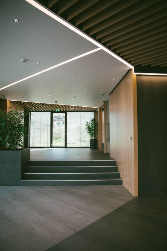 | Deckenstruktur | Sichtdecke (Beton mit Putz), Höhen von 2,9 m im Bürobereich bis 4 m in der Lobby |